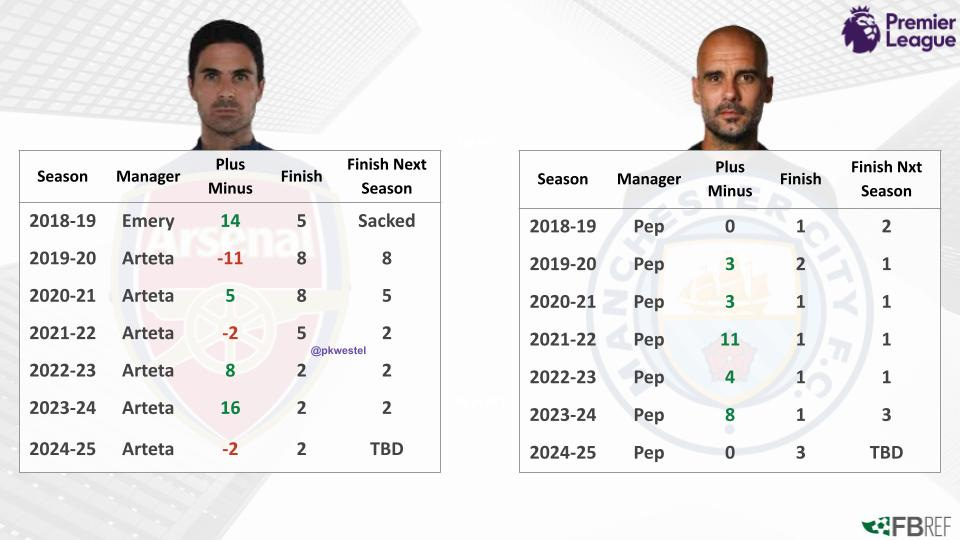 Eleven different managers comprise the bottom 15 positions. Five of those 11 also appear in the top 15. The most noteworthy of them all is Mikel Arteta. In six seasons managing at Arsenal Arteta has had five seasons in either the top or bottom of this metric. He lives at the extremes.