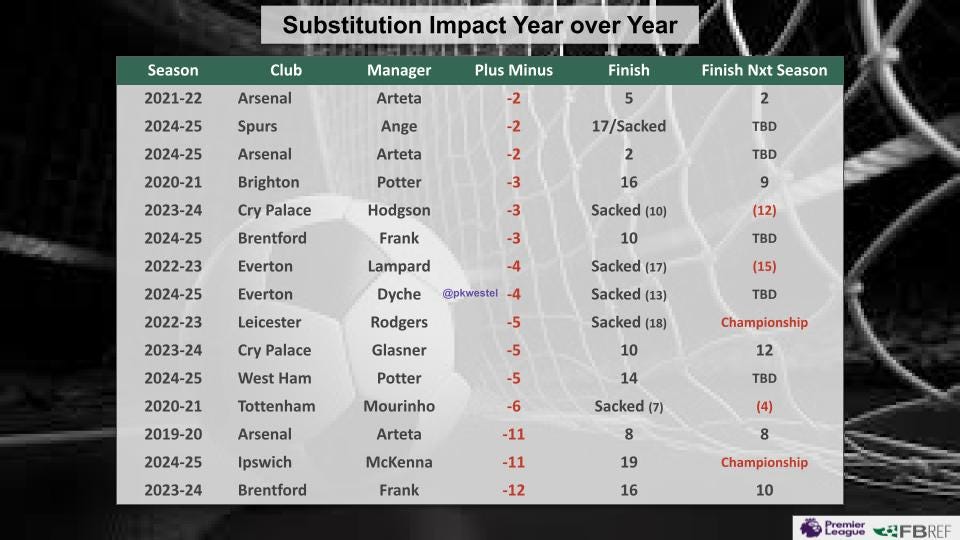 Having a low score over the course of a season says more about your squad depth than your ability as a coach. In 2022-23 Thomas Frank made 4.44 subs per match - third most in the sample. His plus minus was +10 - largely fueled by having the 20 goal Ivan Toney, who scored seven of his 14 non-penalty goals in the final 30 minutes of matches. A year later Frank’s subs per match was 4.42 but his plus minus dropped to -12. That’s largely because he didn’t have the squad depth. Toney missed a chunk of the season serving a suspension and upon his return he just didn’t score. Every game where he made lots of subs made his team weaker and they fell apart late.