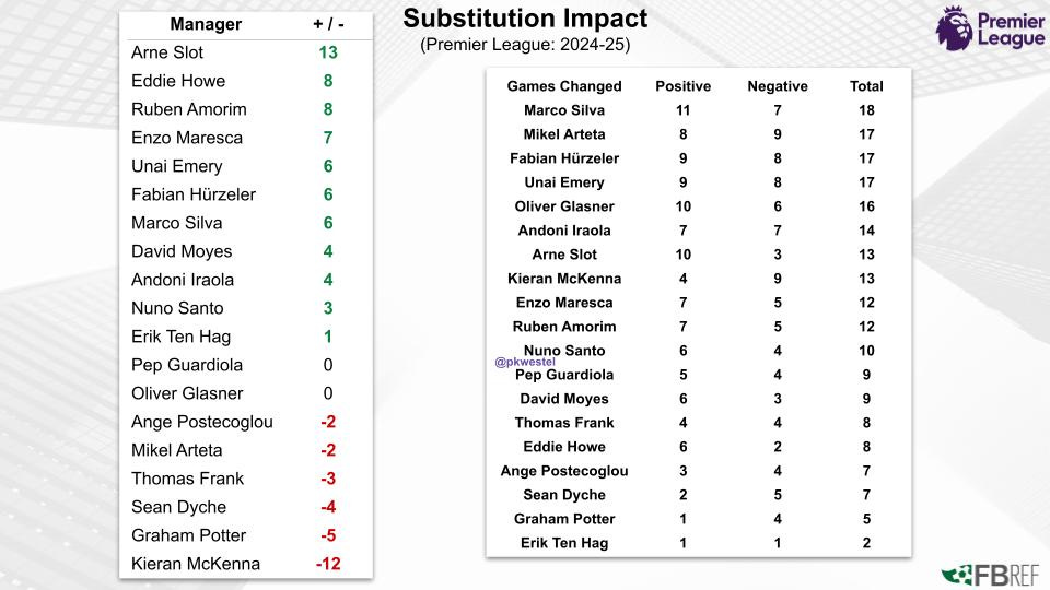 And that volatility is exactly what makes Arteta the perfect bridge between the managers with low substitution impact scores and those with the highest. He’s one of the few to appear at both ends of the spectrum showing that high or low scores often say more about the squad context than the coach. So what happens when a manager posts a high impact score?