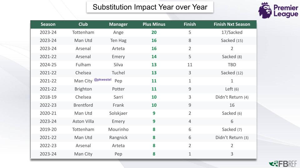 On that chart of the top-15 scores, only two coaches managed to crack the list multiple times without getting sacked the following season. Pep and Arteta have combined to manage 12 and a half seasons at their current club but only crack the list four times. Substitution impact just doesn’t seem to translate year over year.
